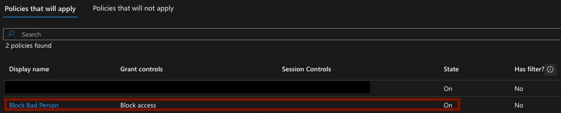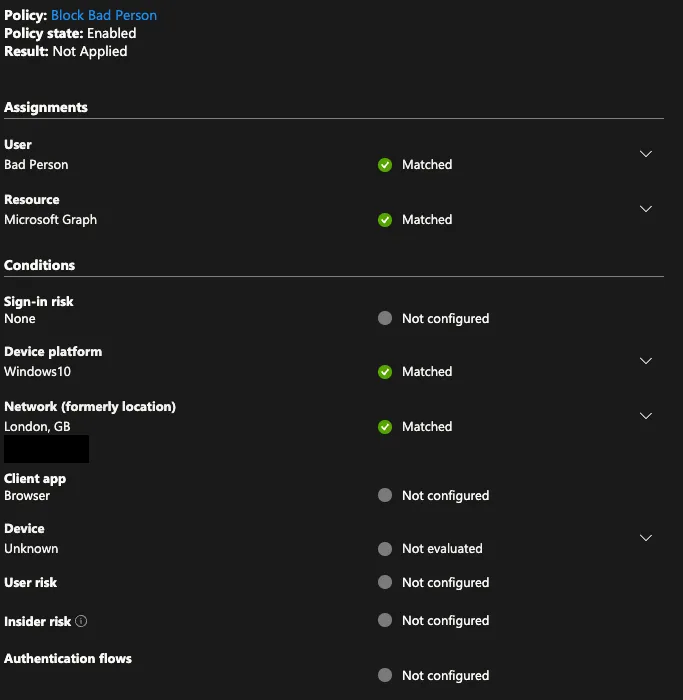 This gave us something more interesting, which was a full description of the policy! You can see the full output of this example policy which was built to keep one user completely out of the tenant: