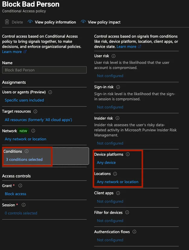 For the lucky few that have to deal with Microsoft Entra tenants, Conditional Access policies are considered a cornerstone of identity security in a given tenant. You can create all sorts of powerful policies that restrict access to your organisation from only a handful of accepted devices and are the main available way to enforce controls like Multi-Factor Authentication (MFA) across an estate. They are also an effective way of explicitly blocking access to user principals if they don’t fulfil specific criteria. If you were ever in a position where you were testing a policy and ended up locking your test account out by accident and had to use a breakglass account to recover, then you know first-hand how effective this can be!